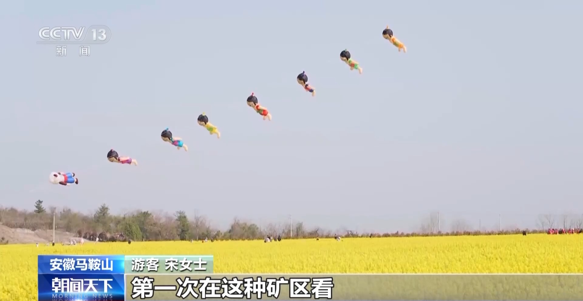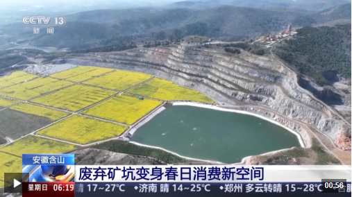 在含山县仙踪镇大山尾矿坑公园,千亩油菜花海正值观赏季,游客漫步在花海中,有的拍照留念,有的放飞风筝,共同享受悠闲的春日时光。绿色的矿山阶梯、碧波荡漾的水塘、黄灿灿的金色花海,废弃矿山变身农耕生态休闲公园。
