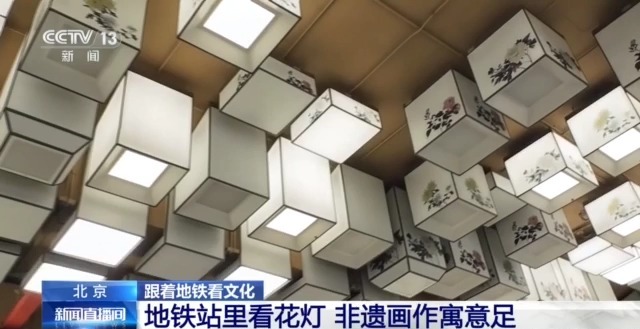 刷卡进站,抬头望去,方形的灯错落有致。上面有菊花、牡丹等花朵彩绘,寓意花开富贵,站厅层这样的灯有1000多个。