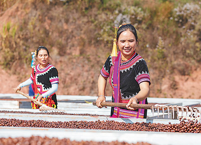 咖农在翻晒咖啡豆。人民网记者 虎遵会摄