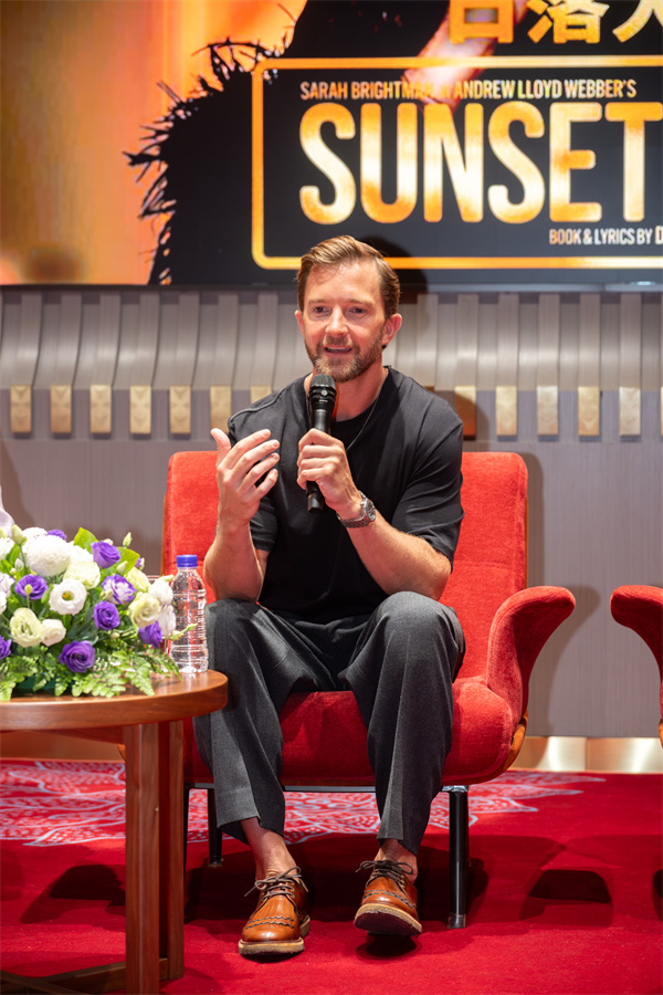 蒂姆·德拉克斯担任男主角乔·吉利斯。这也是蒂姆第一次来到中国,他表示很期待这一次艺术无国界的东方之旅。主演见面会上,蒂姆现场献唱《日落大道》同名经典唱段,在歌中表达了乔控诉好莱坞的虚伪、梦想的幻灭,以及乔对自己选择出卖灵魂以换取奢华生活所感到的压抑的呐喊。他展现的丝滑嗓音以及强大的戏剧张力,将现场气氛推向高潮。