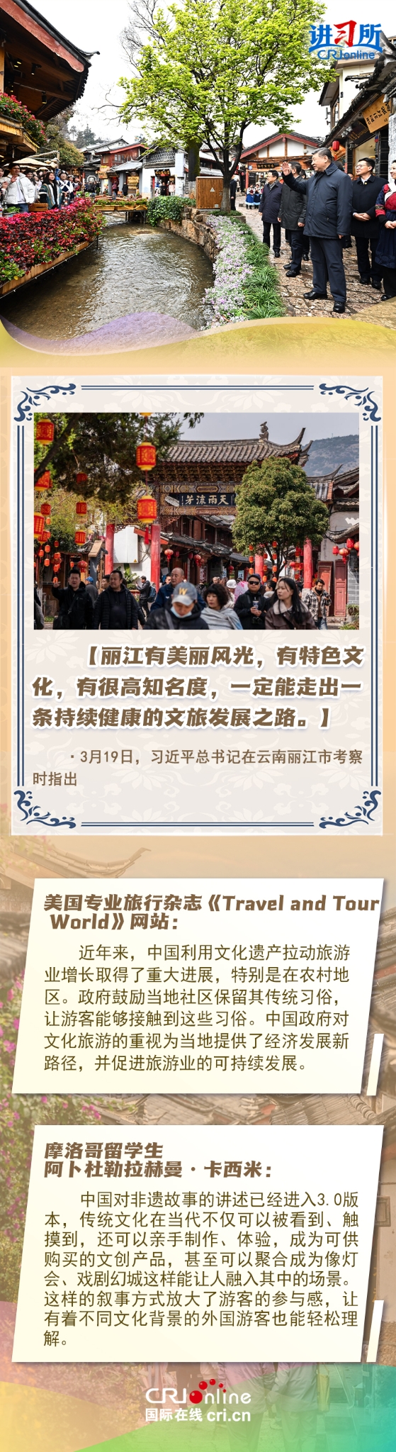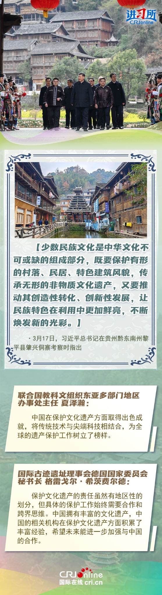习近平总书记近日赴贵州、云南考察。他走进民族特色村寨、历史文化古城,心系历史文化遗产保护和文旅融合发展。习近平特别叮嘱当地官员和群众,既要保护有形的村落、民居、特色建筑风貌,传承无形的非物质文化遗产,又要推动其创造性转化、创新性发展。