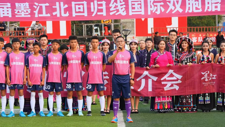 “天下奇迹总成双,'村超'热浪接墨江。足球旋风与双生秘境相遇在激情四射的榕江,借此难得的机会,我向大家介绍神圣、神奇、神秘的双胞之家、双生之城——云南墨江。”墨江县委书记杨波变身球员在球场推介第十九届墨江北回归线国际双胞胎节,诚邀全国游客5月1日到墨江打卡旅游。