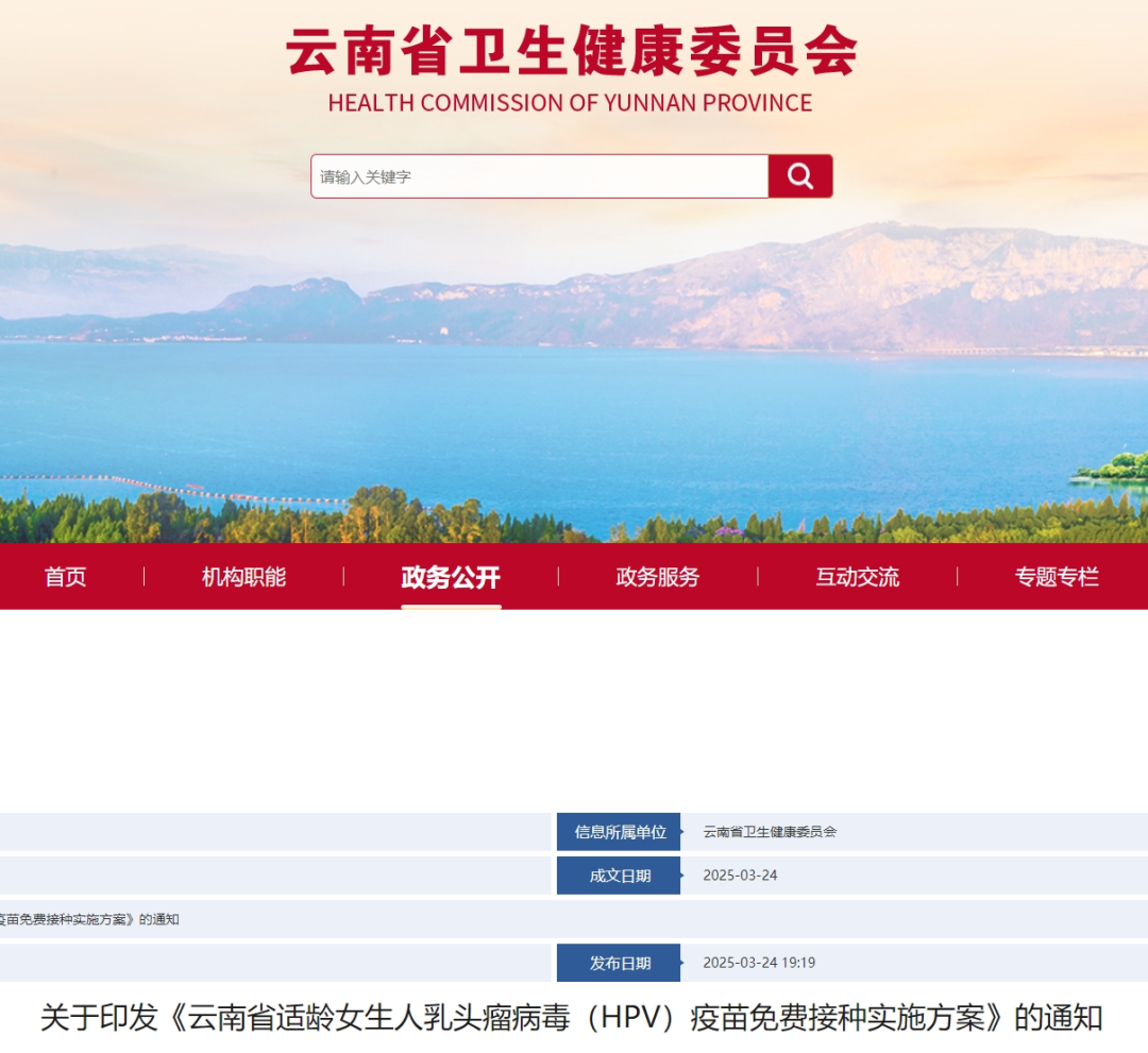 3月24日,云南省卫生健康委员会网站发布《云南省适龄女生人乳头瘤病毒(HPV)疫苗免费接种实施方案》。