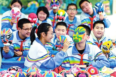3月25日,在甘肃省张掖育才中学,学生们开心地展示彩绘戏剧脸谱作品。杨潇摄