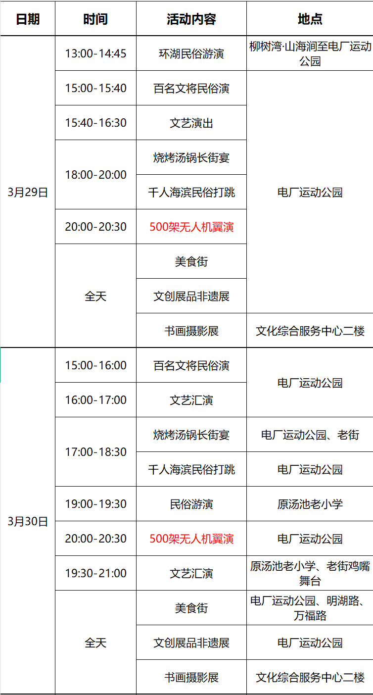 3月29日至31日,阳宗海电厂运动公园还将“变身”民俗嘉年华。市民不仅可以品尝美味的烧烤、汤锅、长街宴,还可以参与到千人海滨民俗打跳活动中,体验当地的民俗风情。