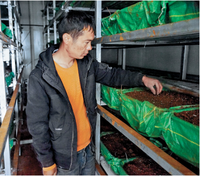 赵进波查看红托竹荪长势。