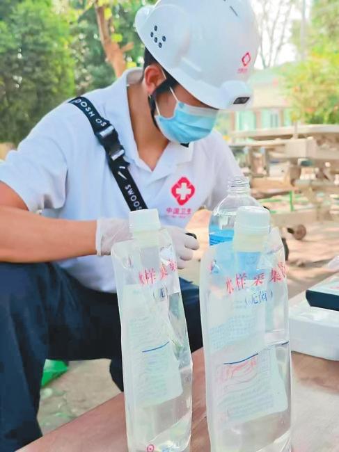 中国云南救援医疗队在千床医院对饮用水和紧急用水开展水质检测。