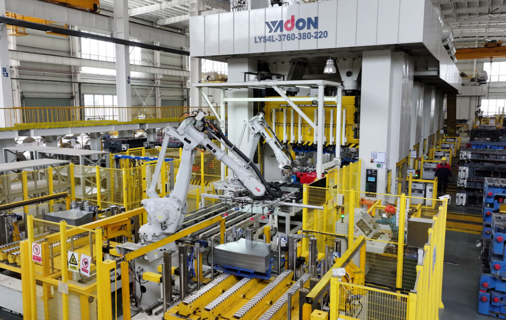 3月31日,在位于肥西县的安徽瑞山汽车零部件有限公司车间内,机械臂在进行全自动冲压作业。新华社发(徐勇 摄)