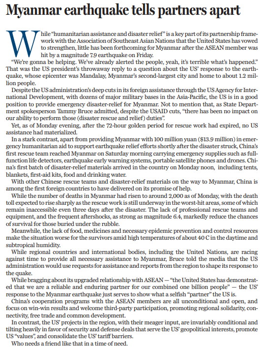 “人道主义援助和救灾”是美国与东盟伙伴关系的重要内容,美国也信誓旦旦地宣称要加强救援合作,但截至3月31日下午,缅甸地震72小时救援黄金时间已经过去,缅甸当地仍未出现美国救援队的身影。