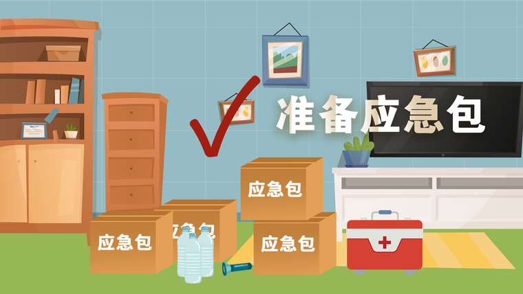 应急包:包含手电筒、备用电池、饮用水(每人每天至少3.8升)、食品(无需加工)、急救药品、便携式收音机、重要文件、现金、哨子等。