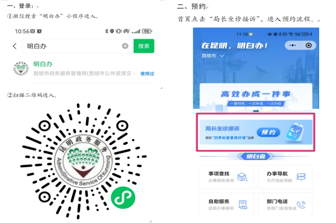 “挂号”方式:请在微信小程序搜索“明白办”——“局长坐诊接诉”服务专区进行预约“挂号”。