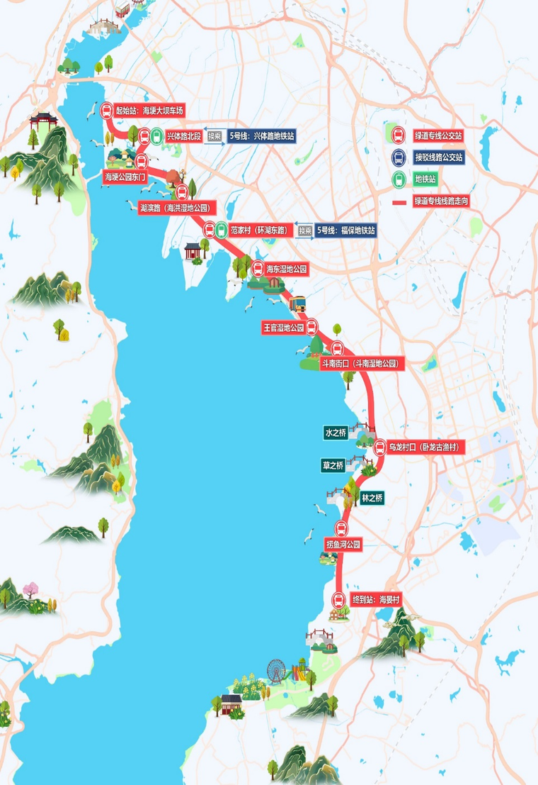 “滇池绿道专线”途经海埂大坝车场(起始站)、兴体路北段、海埂公园东门、湖滨路(海洪湿地公园)、范家村(环湖东路)、海东湿地公园、王官湿地公园、斗南街口(斗南湿地公园)、乌龙村口(卧龙古渔村)、捞鱼河公园、海晏村(终到站)11个站点。海埂大坝车场发车时间为9:00、11:00、13:00、15:00;海晏村发车时间为11:00、13:00、15:00、17:00,票价10元/人,凭当日车票(电子或纸质票)可不限次乘坐。