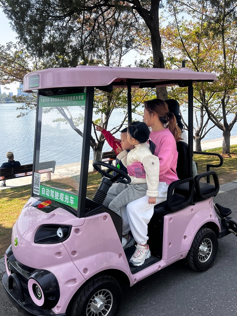 “自动驾驶已启动,准备出发!”今年玄武湖景区新引进的无人自助驾驶观光车,吸引了许多游客体验。景区无人自助驾驶观光车负责人魏胤熙告诉记者,新推出的观光车集观光、代步与互动功能于一体,通过视觉雷达+北斗卫星系统,结合AI算法和AI交通大模型,实现自主巡游揽客、灵活避障、一键叫车等功能,还能切换自动驾驶与自主驾驶模式, 2-4 人座设计,与景区现有摆渡车互补,大大增强了游客游玩的便捷性。