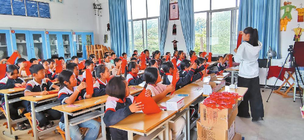 在普洱学院“浸润计划”中,学院学生指导当地中小学生做剪纸。