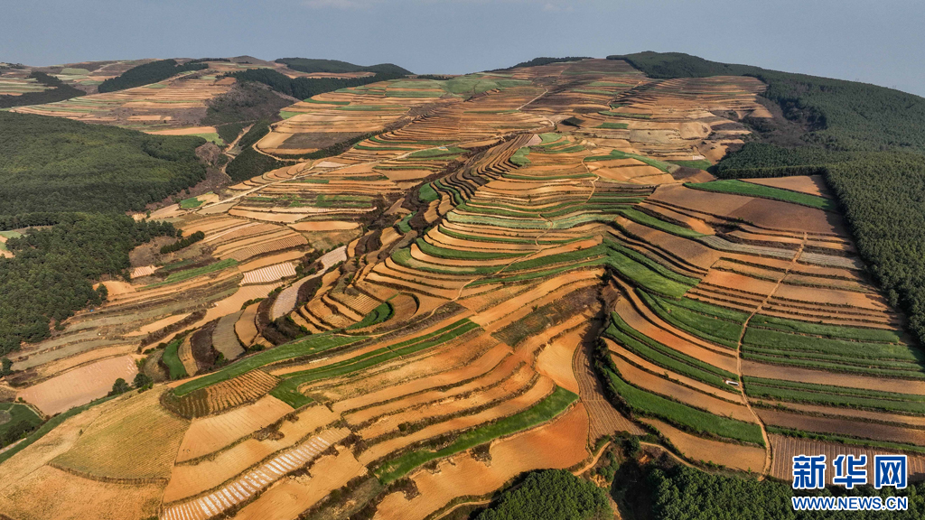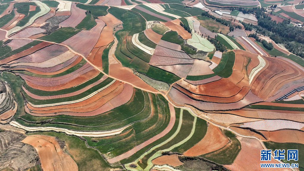 仲春时节,昆明市寻甸回族彝族自治县山地梯田错落有致,无人机视角下,有的田地绿意盎然、生机勃勃,各类农作物旺盛生长;有的田地则经农民翻耕平整后,呈现红褐色。色彩斑斓的梯田,与山道、村庄、水库相映成趣,构成了一幅乡村田园美景图。