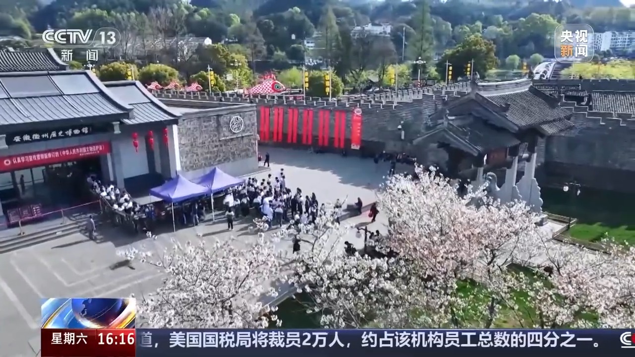 位于皖南的安徽黄山市迎来了最美赏花季,在歙县徽州古城的城墙下、谯楼边、牌坊旁,一簇一簇的樱花迎春绽放,花团层层叠叠,洁白如雪,与徽派古建筑相互映衬。游客穿行其中,逛博物馆、了解徽州文化,享受千年古城的独特魅力。