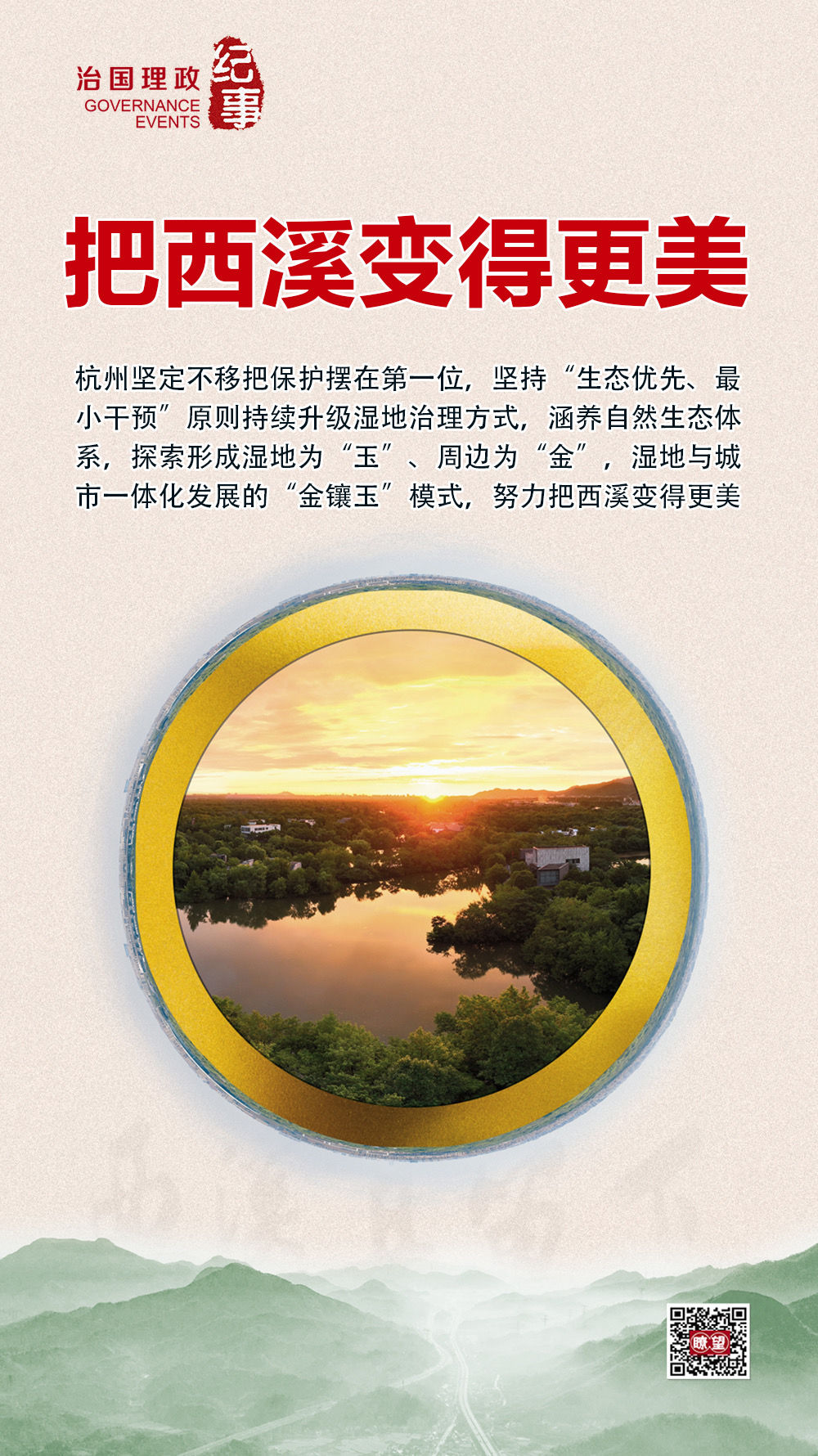 ◇“水是湿地的灵魂,自然生态之美是西溪湿地最内在、最重要的美。要坚定不移把保护摆在第一位,尽最大努力保持湿地生态和水环境。要把保护好西湖和西溪湿地作为杭州城市发展和治理的鲜明导向,统筹好生产、生活、生态三大空间布局,在建设人与自然和谐相处、共生共荣的宜居城市方面创造更多经验。”习近平总书记这样强调。
