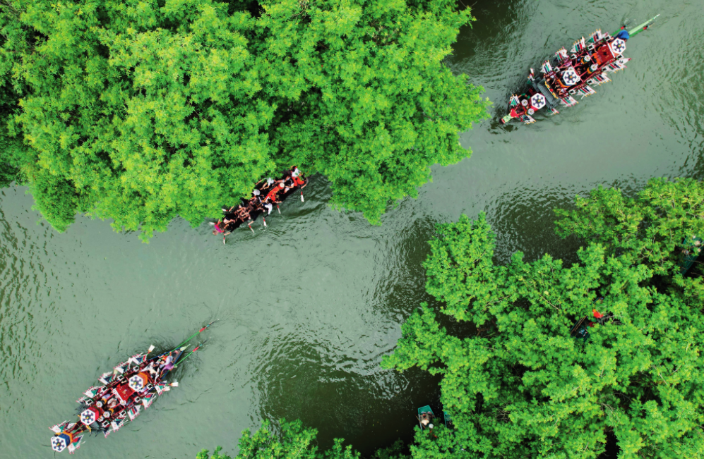 龙舟穿梭在西溪湿地的 河道中(2023年6月22日摄) 龙巍摄 / 本刊