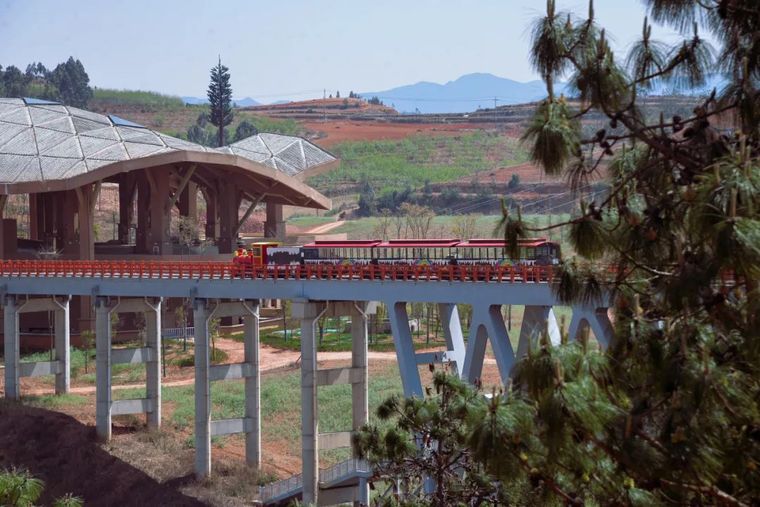 红色铁轨在春日大地上格外醒目