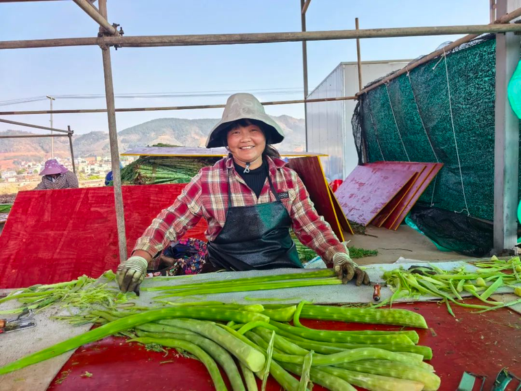 村民万女士高兴地说:“我们就是凤莱的村民,来帮他们收贡菜,每天100块钱,就在家门口,老人小娃都能照顾。”