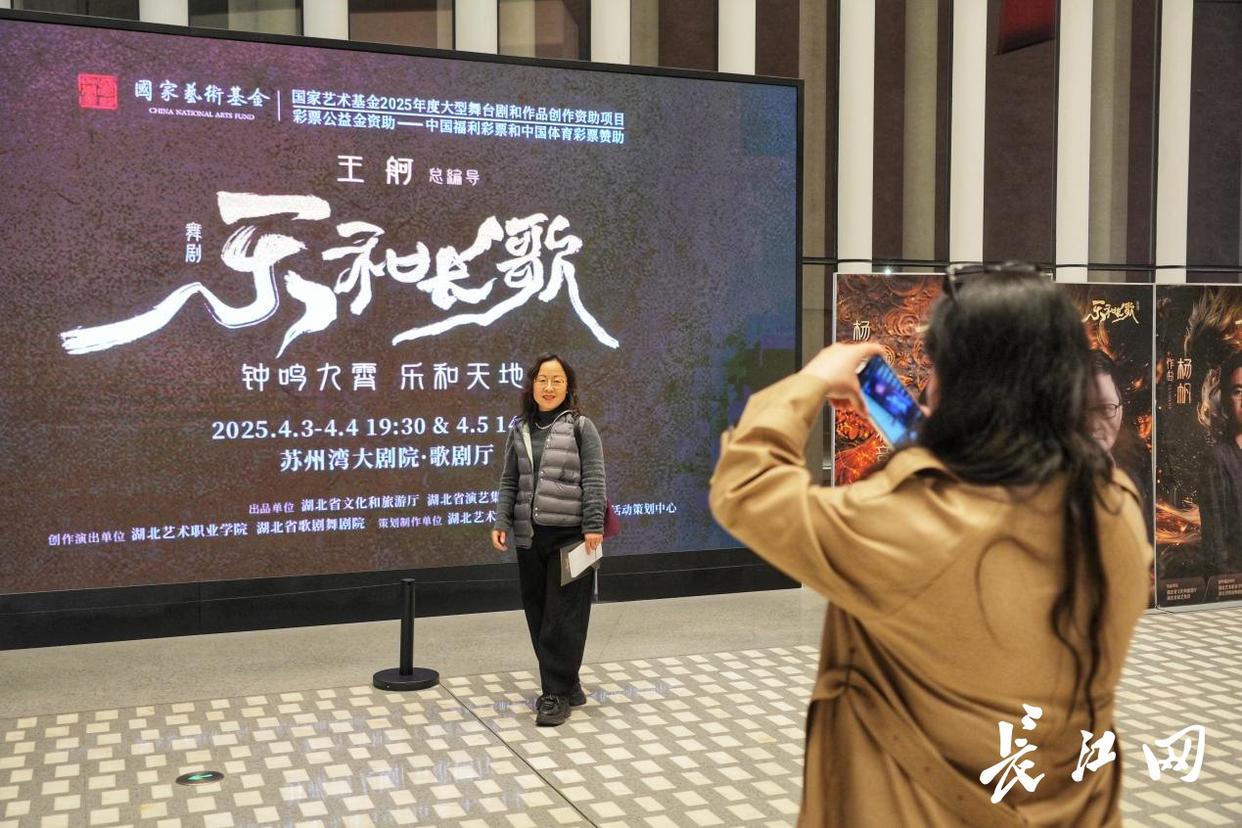 在苏州湾大剧院入场大厅,不少家长领着小朋友进场。记者还见到一位特殊观众,他是驻苏州某部从事文宣工作的吴战士,他表示,作为广东人,他对楚文化充满好奇,一直想去湖北省博看编钟,这次清明假期剧院有三、四部剧演出,他毫不犹豫选择了《乐和长歌》。