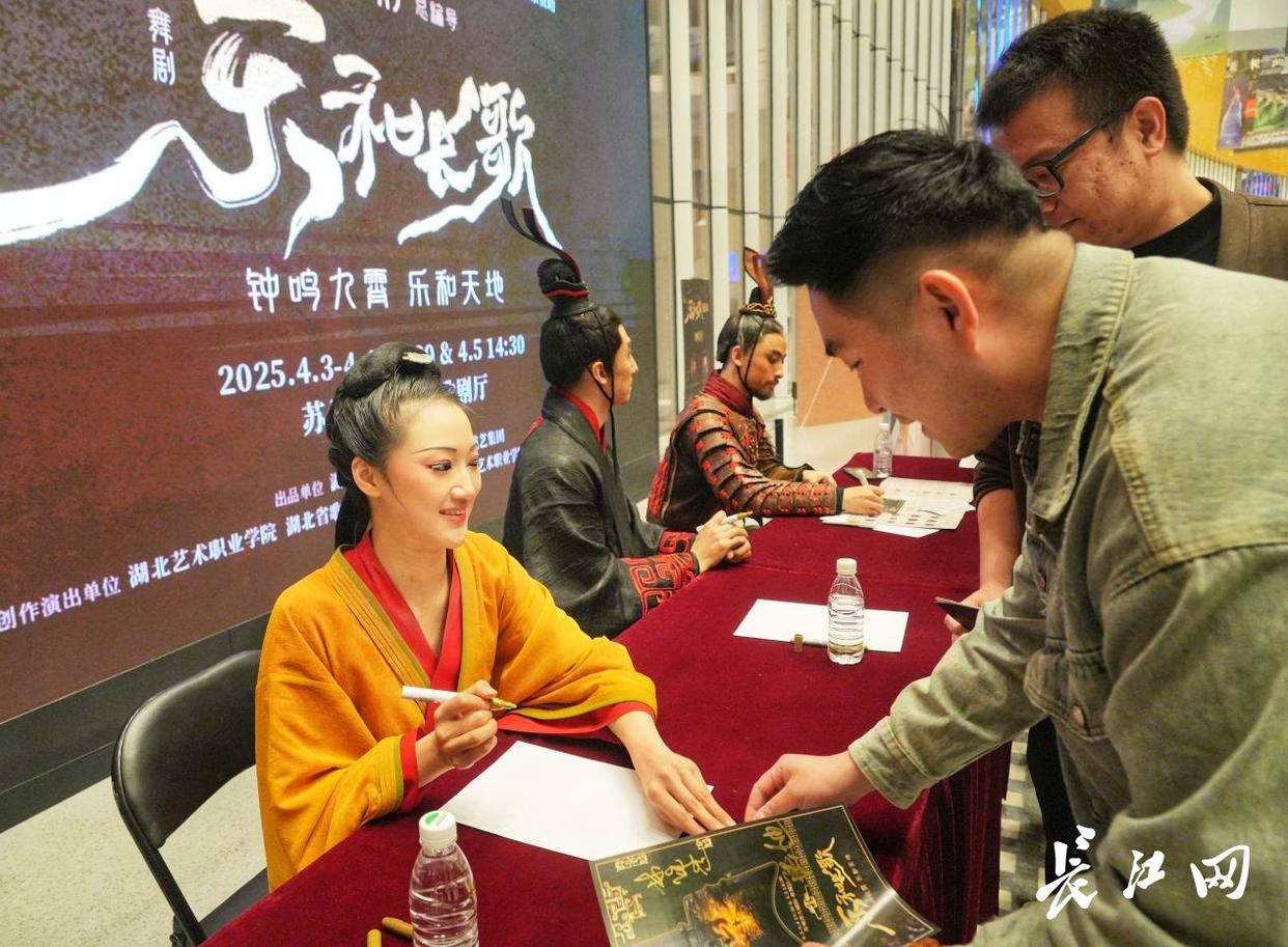 当晚演出高潮迭起,观众多次自发鼓起热烈掌声。演出结束,观众更是排起长队,等候三位主演为他们在剧情手册和门票上签名。苏州大学医学专业研一的郝同学感慨,这部剧的音乐和舞美,让她享受了一场楚文化的视听盛宴!