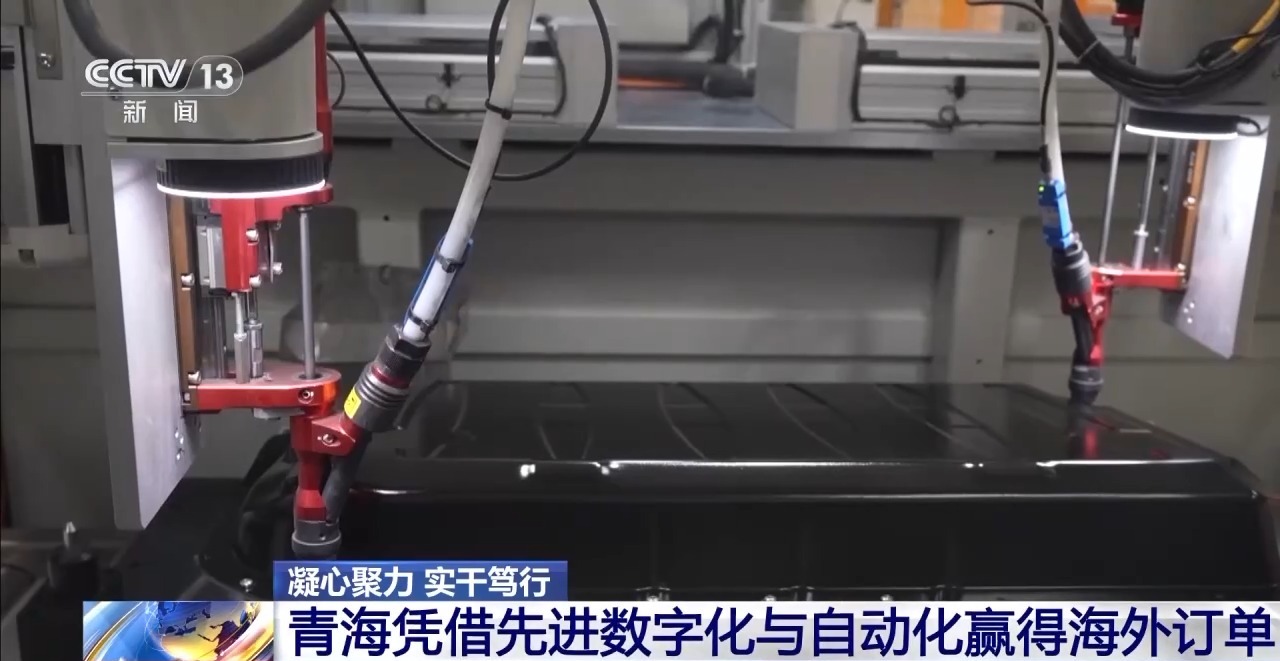 青海弗迪电池有限公司总经理 郭波:我们给客户提供的这条产线全都是自动化。我们要监控螺丝的角度,还有力度,都会实时通过拧紧轴上传到MES(制造执行系统)数据,它会做一个判定,合格会绿灯通过。