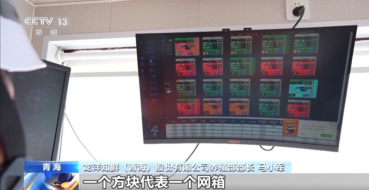 龙洋知鲜(青海)股份有限公司养殖部部长 马小军:一个方块代表一个网箱,闪烁的是已经投喂完成的,绿色的是正在投喂的网箱,以前我们投喂大概七八个人负责,现在三个人就可以管理这个平台。