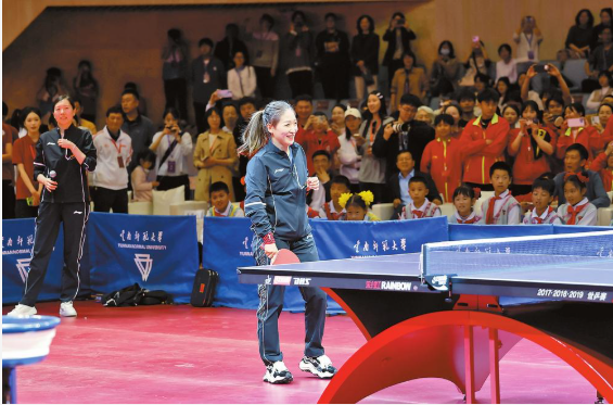 当天下午,他们来到云南师范大学呈贡校区,与在场大学生们面对面交流,分享了自己与乒乓球的故事,传递榜样的力量。