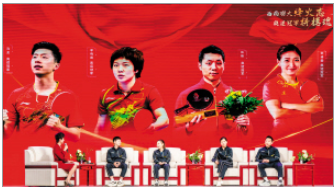 在云南师范大学呈贡校区,4名奥运冠军讲述他们的追梦故事,分享如何用榜样的力量引领自己走出低谷,做更强的自己,为青年学子上了一堂关于爱国、拼搏、追求理想的思政课。4名国球冠军组队与由北京大学、清华大学、南开大学和云南师范大学乒乓球队队员组成的西南联大联队,以及由3名乒乓球爱好者组成的爱好者联队带来精彩表演赛。