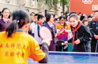 在云南师范大学实验中学,马龙、许昕、刘诗雯、李晓霞带来别开生面的思政与体育融合课堂。他们轮番上阵,与学校乒乓球队小队员切磋球技。初二学生黄浩宸说,通过与冠军交流,他明白了体育运动的魅力在于坚持、超越与热爱,这次难忘的经历也将成为他前进的动力。大家将亲手制作的瓦猫、写有自己梦想的书信送给奥运冠军。