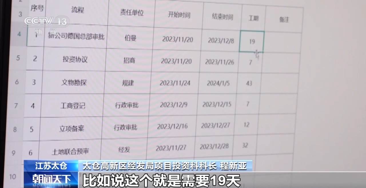 太仓高新区经发局项目投资科科长 程新亚:比如说这个就是需要19天,列了有21个环节,把更多的时间留给企业,政府方去压缩办理的时间。