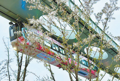 湖北武汉,运行中的光谷空轨与盛开的樱花相映成趣。本报记者 吴 君摄