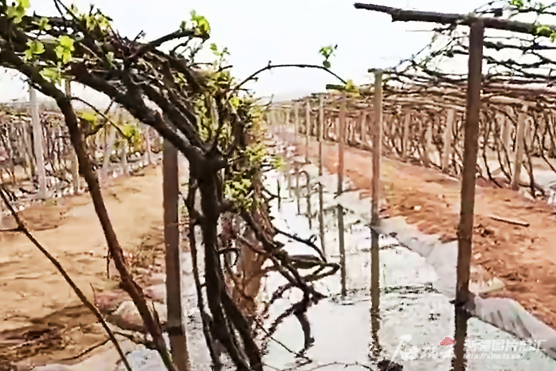4月7日,在鄯善县吐峪沟乡洋海夏村葡萄地,村民艾海提·买买提打开阀门,铺设在地里的高效节水微喷灌管网喷出水花,让葡萄藤及时“喝”上了春灌水。
