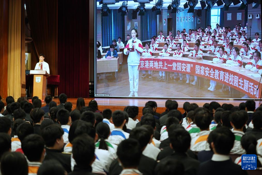 4月9日,在香港培侨中学,北京人大附中分校教师高维阳以“守护文明星火 共筑安全防线”为主题,为学生讲解国家安全相关内容。新华社发(王申摄)