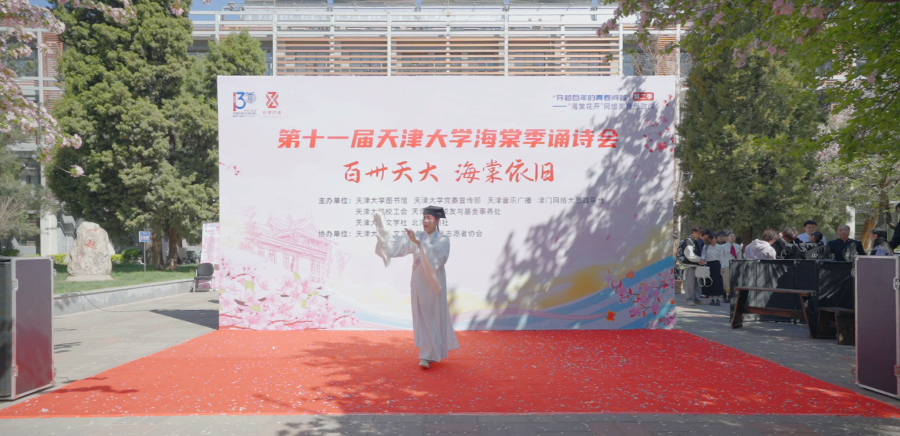 活动尾声,全体表演者合唱《天津大学校歌》,歌声与海棠花一同绽放。以美育人、以美化人、以美培元。一百三十载风雨兼程,天津大学如一面高扬的旗帜,始终屹立于中国高等教育的前沿高地。这场诗会借助网络,成为一堂生动且别具一格的美育思政课。它以艺术为媒介,用美滋养心灵,以思想启迪未来,激励着天大学子传承百年学府精神,担当青春使命,也让更多人接受美的熏陶和思想的洗礼,让美育与思政的力量跨越时空,深入人心。