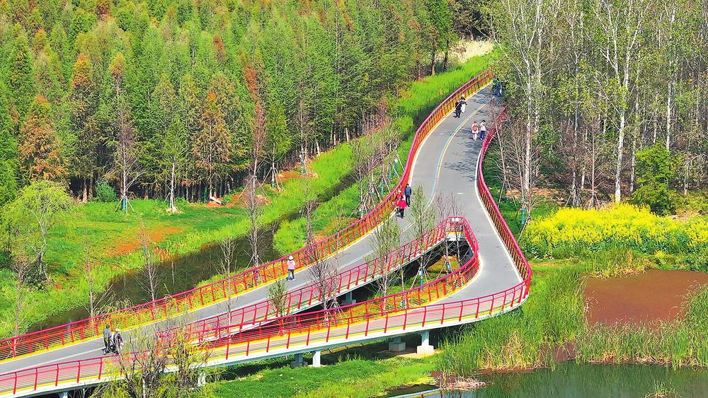 滇池绿道如翡翠缎带,串联起8个湿地、20余个古村,与阳光、蓝天、植物等自然元素相呼应。阳春三月,在滇池绿道呈贡段,初展新绿的水杉、紫色的薰衣草花海,构成一幅五彩缤纷的画卷,吸引游客前往休闲、骑行、拍照打卡。(云南日报记者 张雁群 摄)