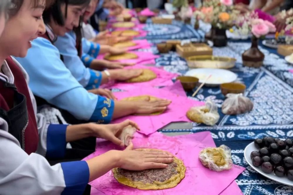 鲁纳古村妇女和身着民族服饰的游人一起制作“班涛”(纳西大月饼)。(供图)