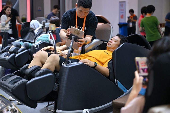 2024年4月17日,参观者在第四届消博会上体验傲胜按摩椅。新华社记者 郭程 摄
