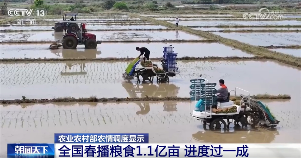 目前,春播正由南向北有序推进。农业农村部最新农情调度显示,目前,全国春播粮食1.1亿亩,进度过一成,与上年基本持平。其中,早稻栽插过四成半,春播马铃薯过半,春小麦过三成,春玉米播种近一成。