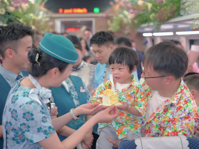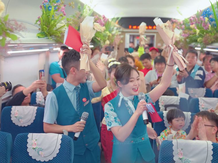 工作人员与旅客欢庆中老铁路国际旅客列车开行两周年。通讯员周涛 摄