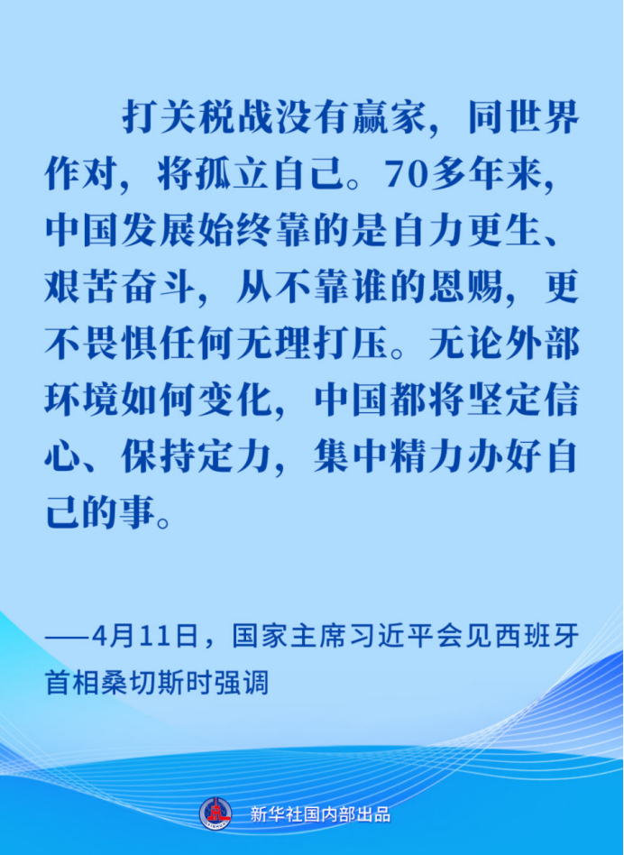 “打关税战没有赢家,同世界作对,将孤立自己。70多年来,中国发展始终靠的是自力更生、艰苦奋斗,从不靠谁的恩赐,更不畏惧任何无理打压。无论外部环境如何变化,中国都将坚定信心、保持定力,集中精力办好自己的事。”