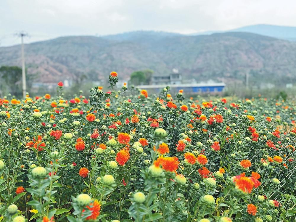 示范区位于弥渡县苴力镇先锋村委会密大村,示范面积为1050亩。示范区采用高产、优质的红花新品种“云红七号”,集成配套以“标准化、规范化、苗期打顶”为核心的高产栽培技术。红花亩产量比传统种植方法增产5%以上,种植成本减少一半,种植管理过程中劳动力成本减少了四分之三,有效降低了病害的发生率和花瓣农药残留。
