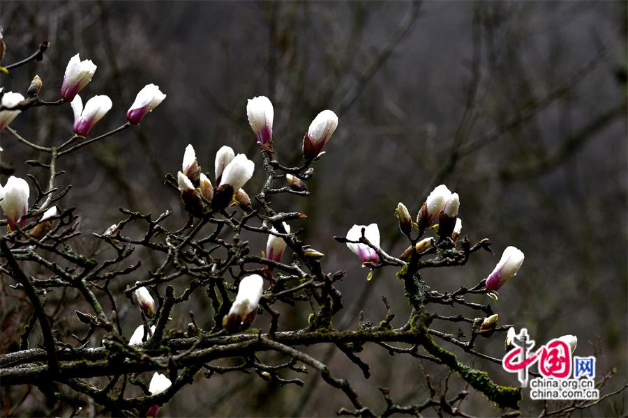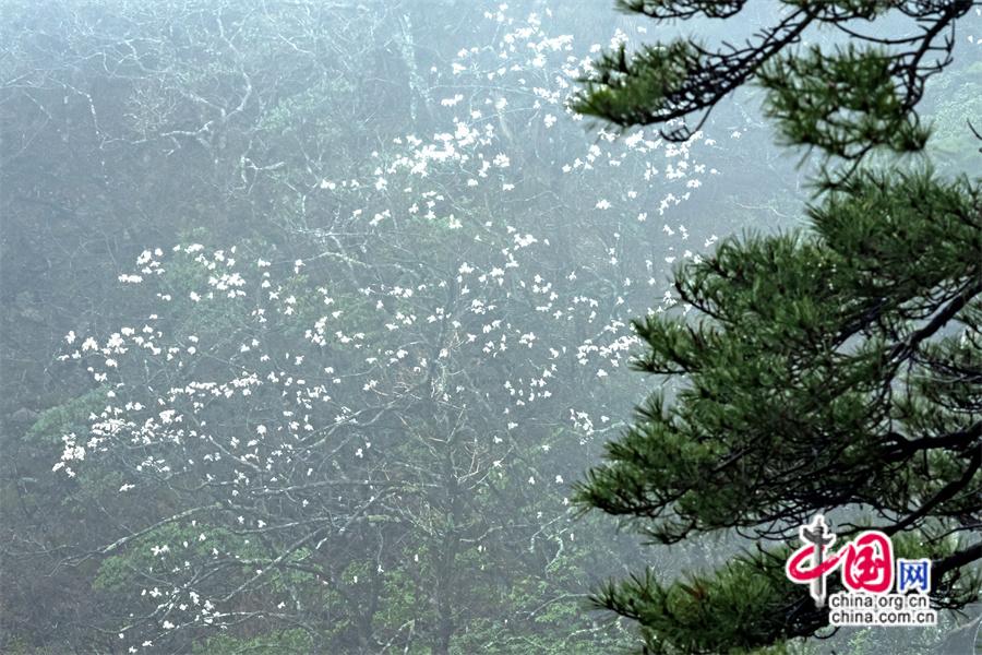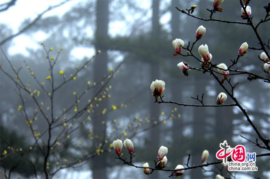 黄山玉兰在群峰、怪石和奇松的映衬下,伸展着褐色枝干,纤细的腰身随风摆动,美不胜收。