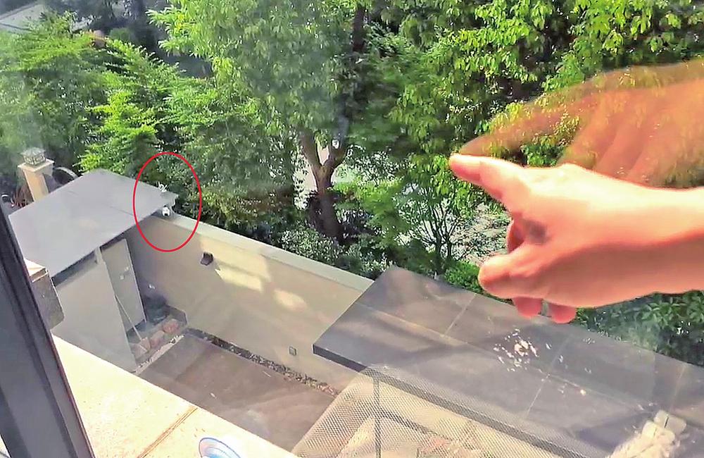 华先生家所在单元共有7层楼,他家住三楼。记者在其带领下来到一扇玻璃窗旁,只见一楼住户家围院的房顶上有一个摄像头正对着华先生家。