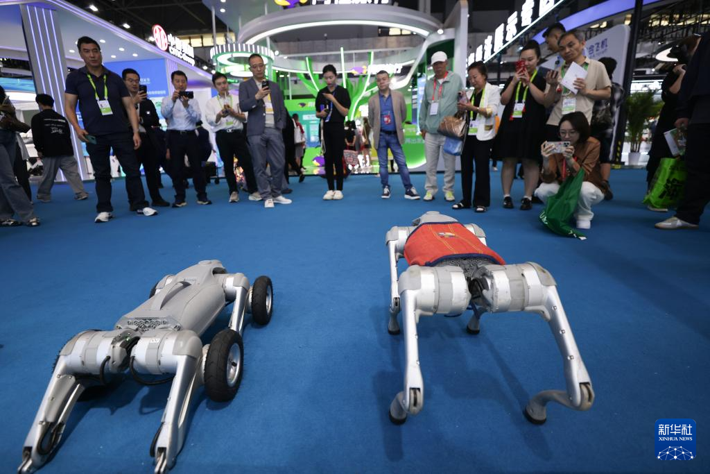 4月13日,宇树科技展示的机器狗在第五届消博会场馆内活动。新华社记者 杨冠宇 摄