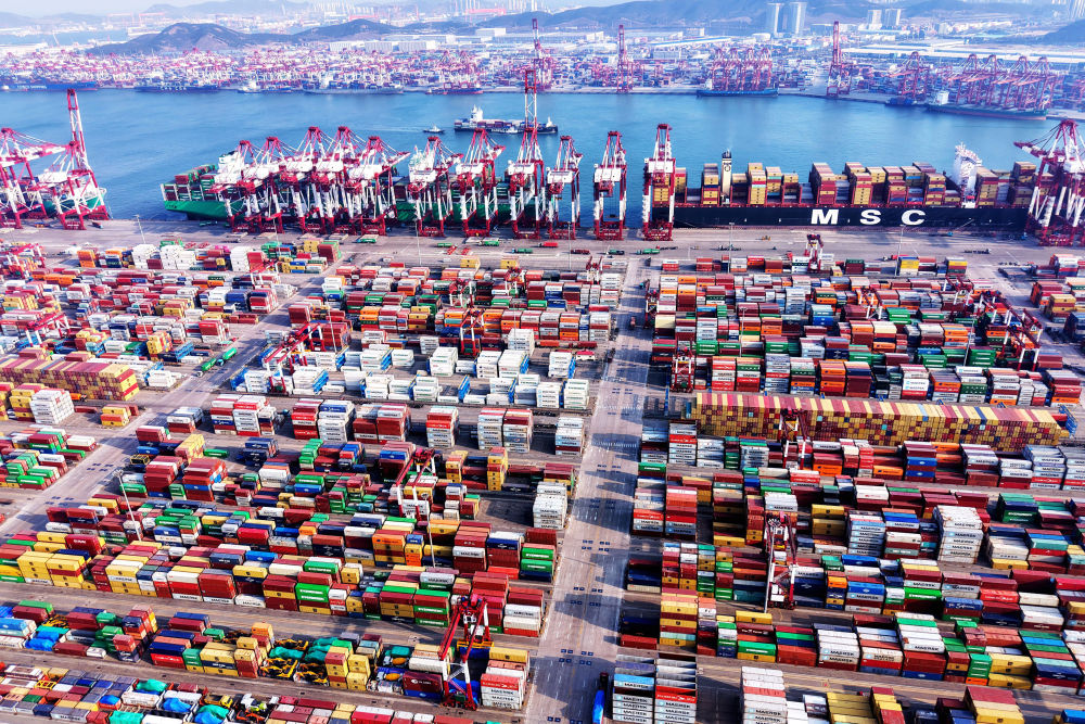 这是2月23日拍摄的山东港口青岛港外贸集装箱码头(无人机照片)。新华社发(俞方平 摄)