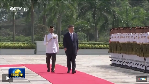 习近平乘车抵达时,易卜拉欣和马来西亚总理安瓦尔在下车处热情迎接。两国元首登上检阅台,军乐团奏中马两国国歌,鸣礼炮21响。习近平检阅仪仗队。两国元首进入国家王宫大厅,同双方陪同人员握手致意。