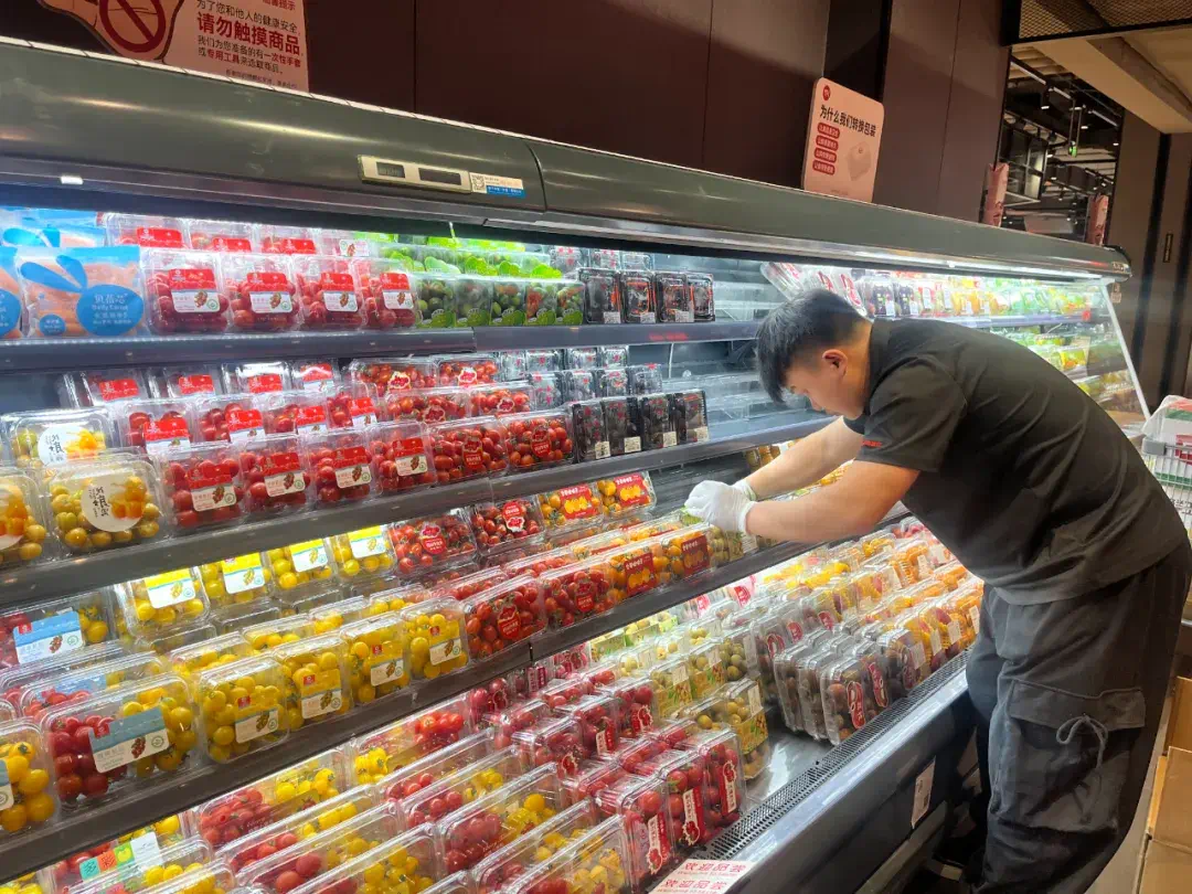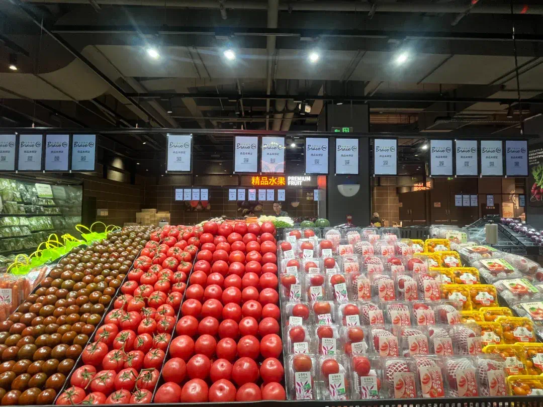 一踏入超市,通透敞亮的布局映入眼帘,蔬菜专区、精品水果区、水产区……划分清晰,已经上架的商品琳琅满目。