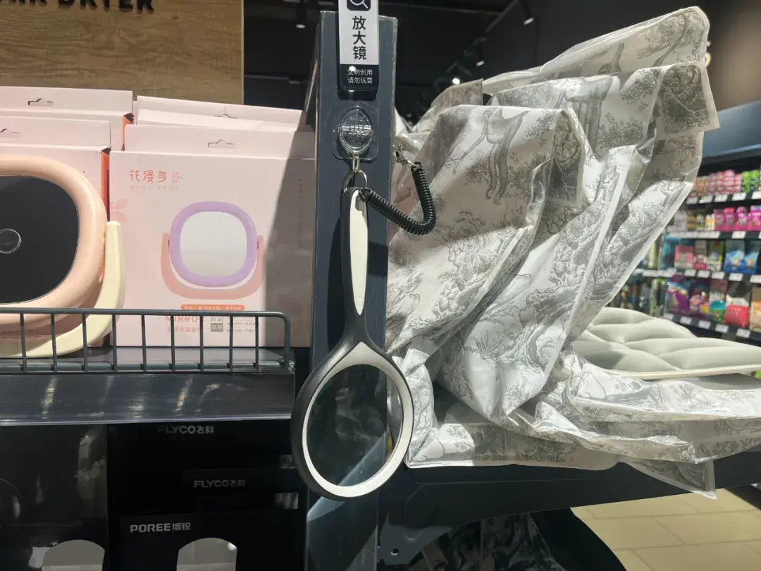 超市内还有不少暖心的服务小细节。买肉可免费切丝切片、货架挂着放大镜方便老年顾客查看标签、散装食品区标注“1斤约几个”的换算提示、易碎品打包处、自助冰袋取用区……增加了市民购物的便利度。